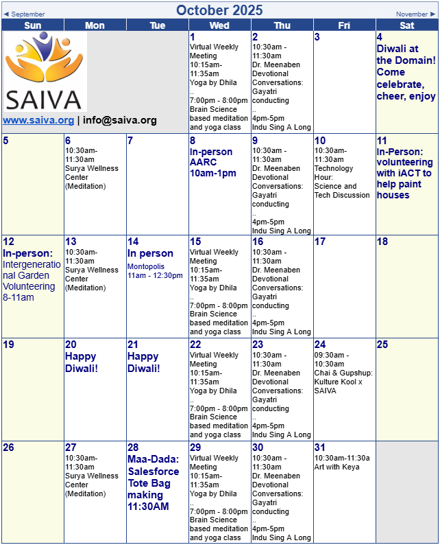 Through the promotion of inter-generational interaction, SAIVA wishes to create a sense of belonging with the establishment of a rooted identity between home (America) and heritage (South Asia). SAIVA wishes to promote these values with dignity, freedom of choice, and treating everyone equally regardless of cultural background, gender, religion, age, nationality or personal beliefs.